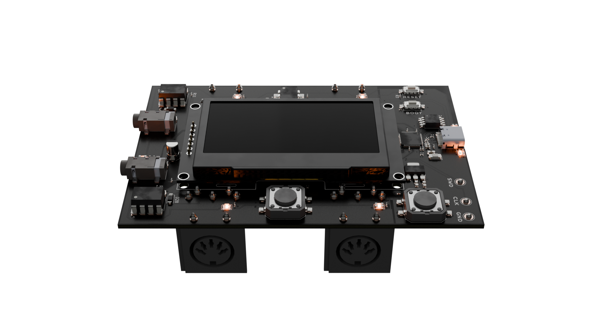 3 pairs of MIDI inputs and outputs, USB MIDI, a pair of RGB LEDs for each, and a bright OLED screen to show you everything you need. Power it from your phone.